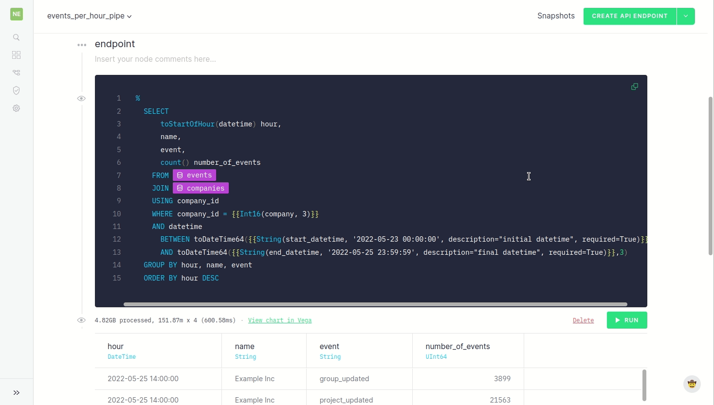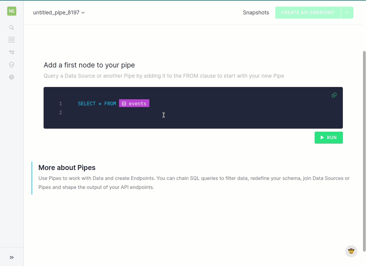 Of course, once that endpoint is created, there are almost always ways to make it better. How might we make it scan fewer rows? How might we shrink latency? These are important questions, but the process of optimizing endpoints can get pretty technical… We can start with pretty basic stuff like refactoring the schema and then we can really scrutinize and improve speed by creating materialized views (that is, Pipes that, instead of ending in an endpoint, end in a Data Source with the best schema and/or aggregation to make queries faster) or other important good practices like using subqueries for JOINs.
