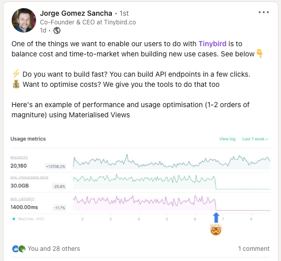 This is why Tinybird does stuff like recommend schema for your data sources or automatically choose an optimal configuration for (most) Materialized Views: so you can get to your results faster. We don’t want you to obsess over your data source schemas or whether your pipes need to be materialized and then not build an endpoint. We want you to build endpoints so you can build products!