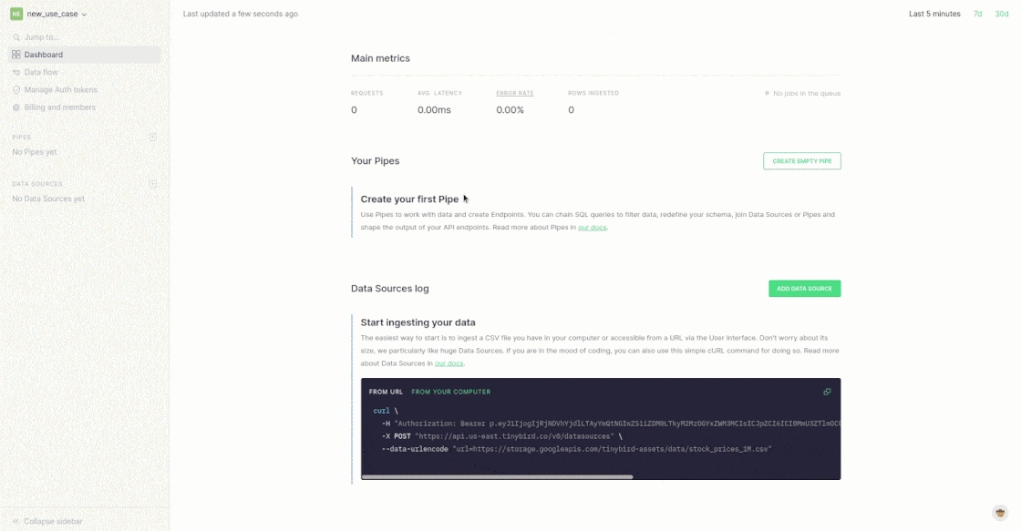 Rather than setting up ingestion pipelines from the beginning, start with a sample set of data. One of the simplest ways to do this is to drag and drop a CSV or NDJSON file into the Tinybird UI.