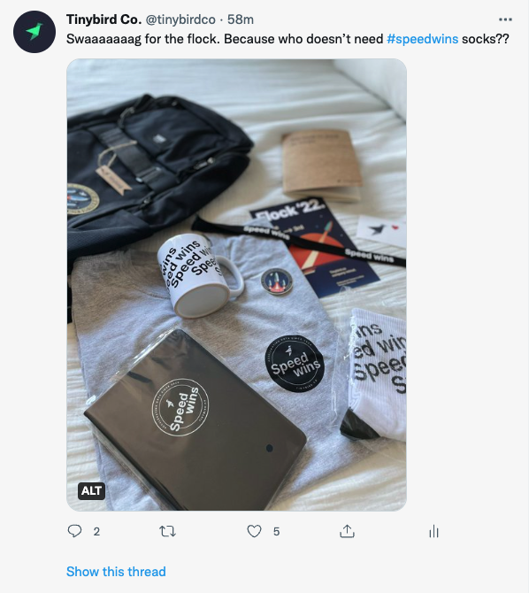 I hope this helps explain why we think the “working backwards” attitude works for product development. The important point is this: Tinybird was built for speed. That means speed in our product (aka blazing endpoint response times), but also speed when building the product (through rapid prototyping and iteration of the data project). “Speed wins'' is our de facto company motto. We even put it on socks…