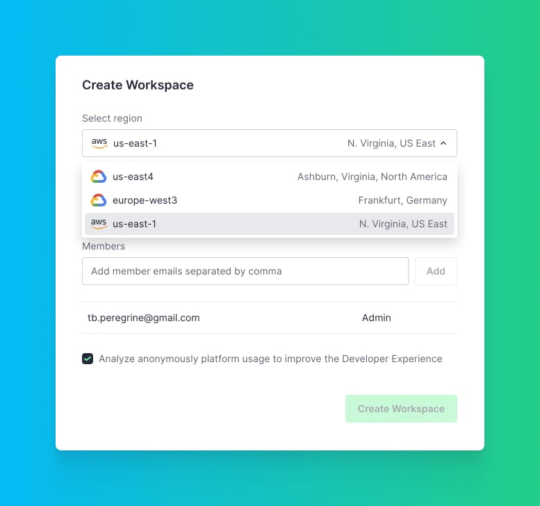 Once you have signed up for a free Tinybird account, set up your first Workspace in an AWS region.