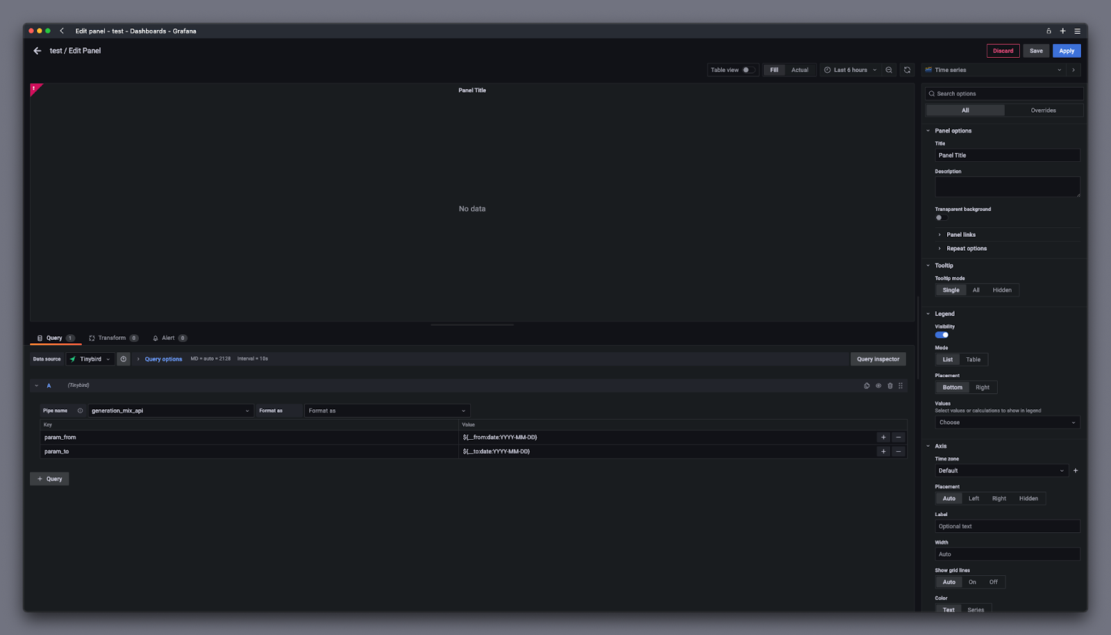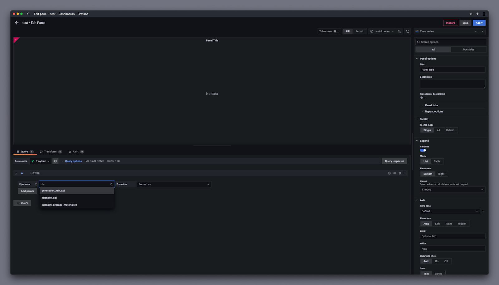 Select Tinybird as the Data Source, and then select the query you want to visualize from the dropdown.