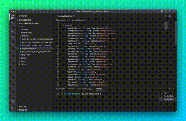 The new VS Code Extension is the latest example of our commitment to better DX, because what could be more comfortable than working on data projects in your favorite IDE? Now you can work with Tinybird and keep your "flow". No context switching back to the UI or terminal, no vim, plus all of the other things - plugins, themes, shortcuts, snippets, copilot, etc. - that make VS Code the most popular IDE in the world.