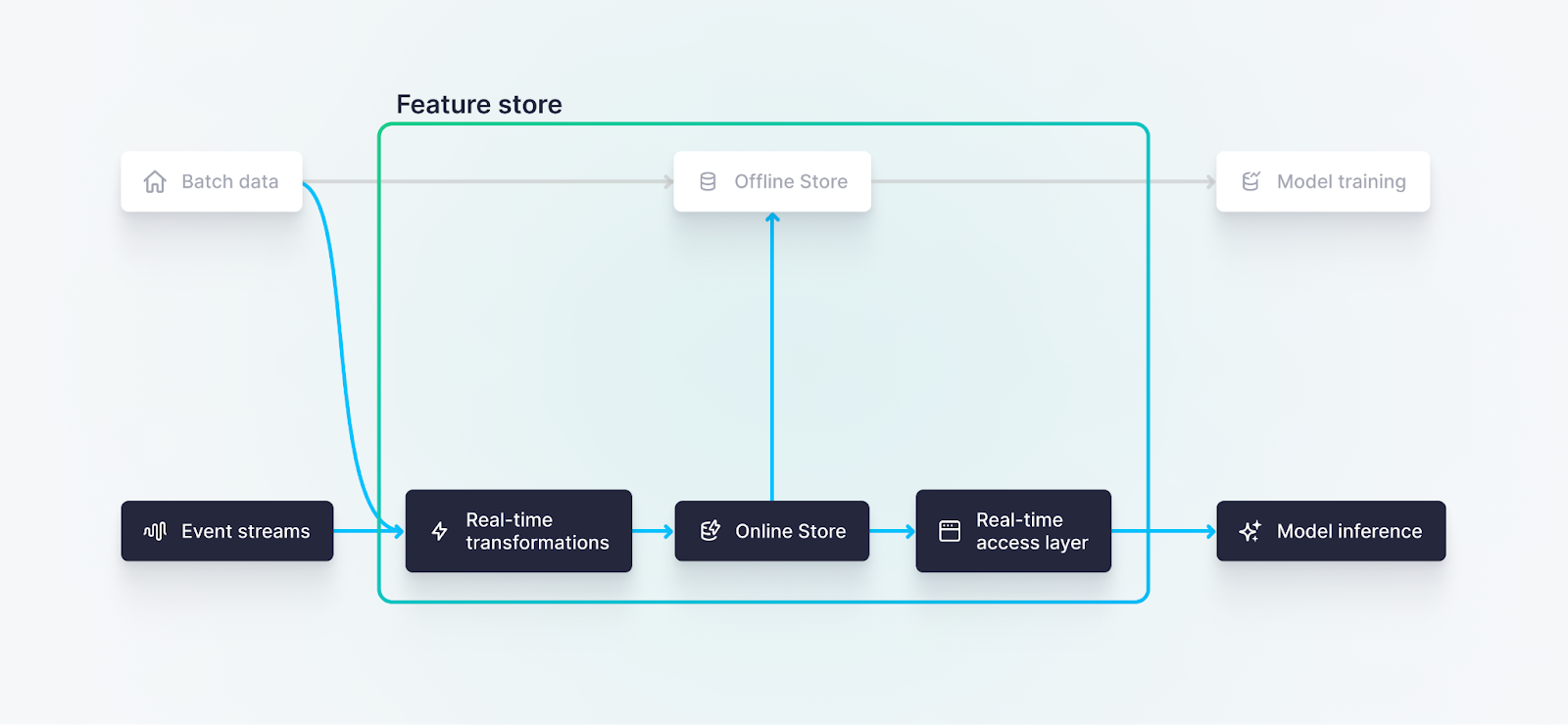 Most feature store implementations using Redis or DynamoDB simply push static values from the offline store into these high-concurrency key-value lookup services. The features can be accessed quickly, but they’re still stale.
