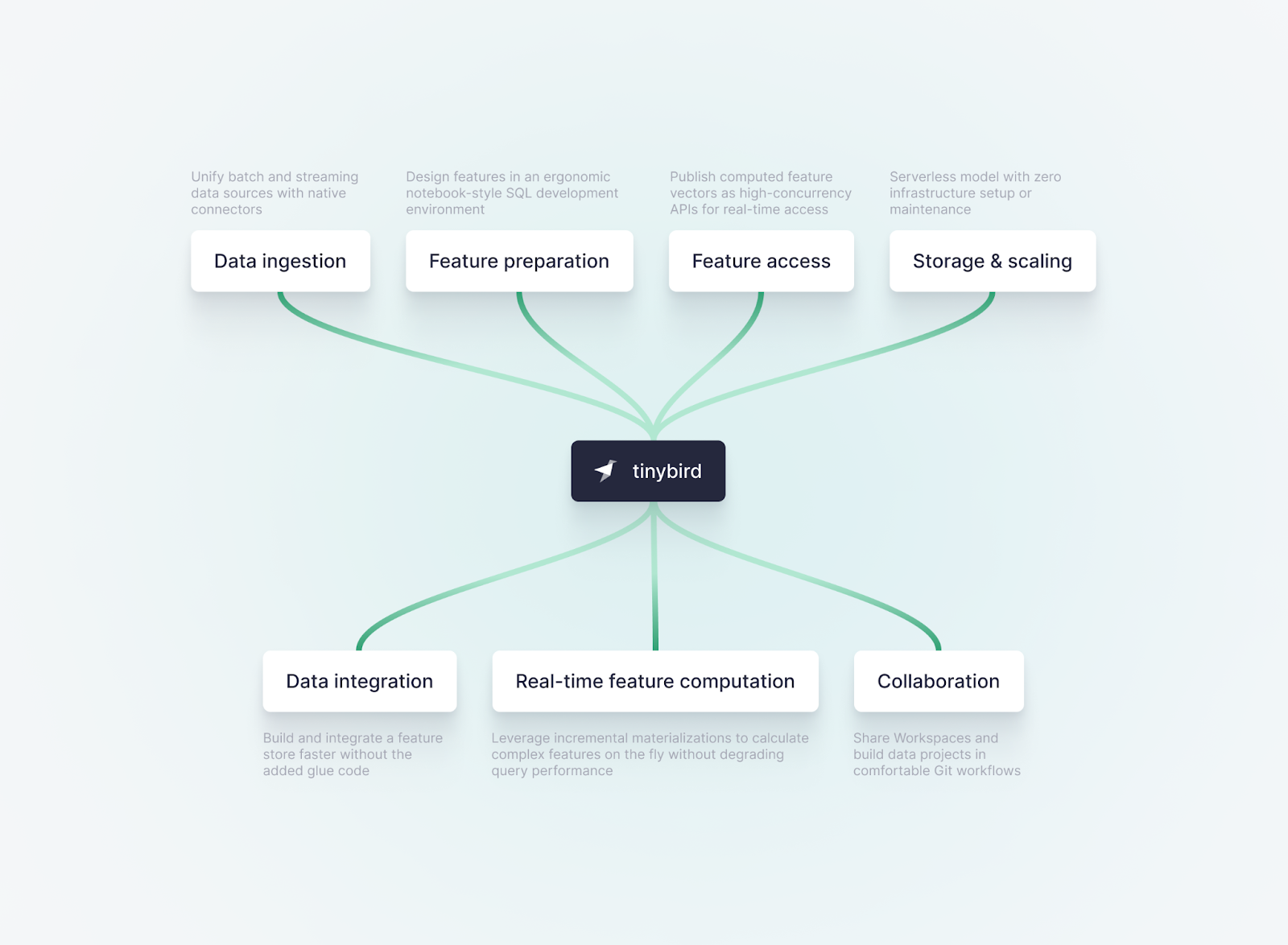 Tinybird truly functions as a serverless online feature store-as-a-service, providing all the necessary functionality without any of the add-ons or glue code.