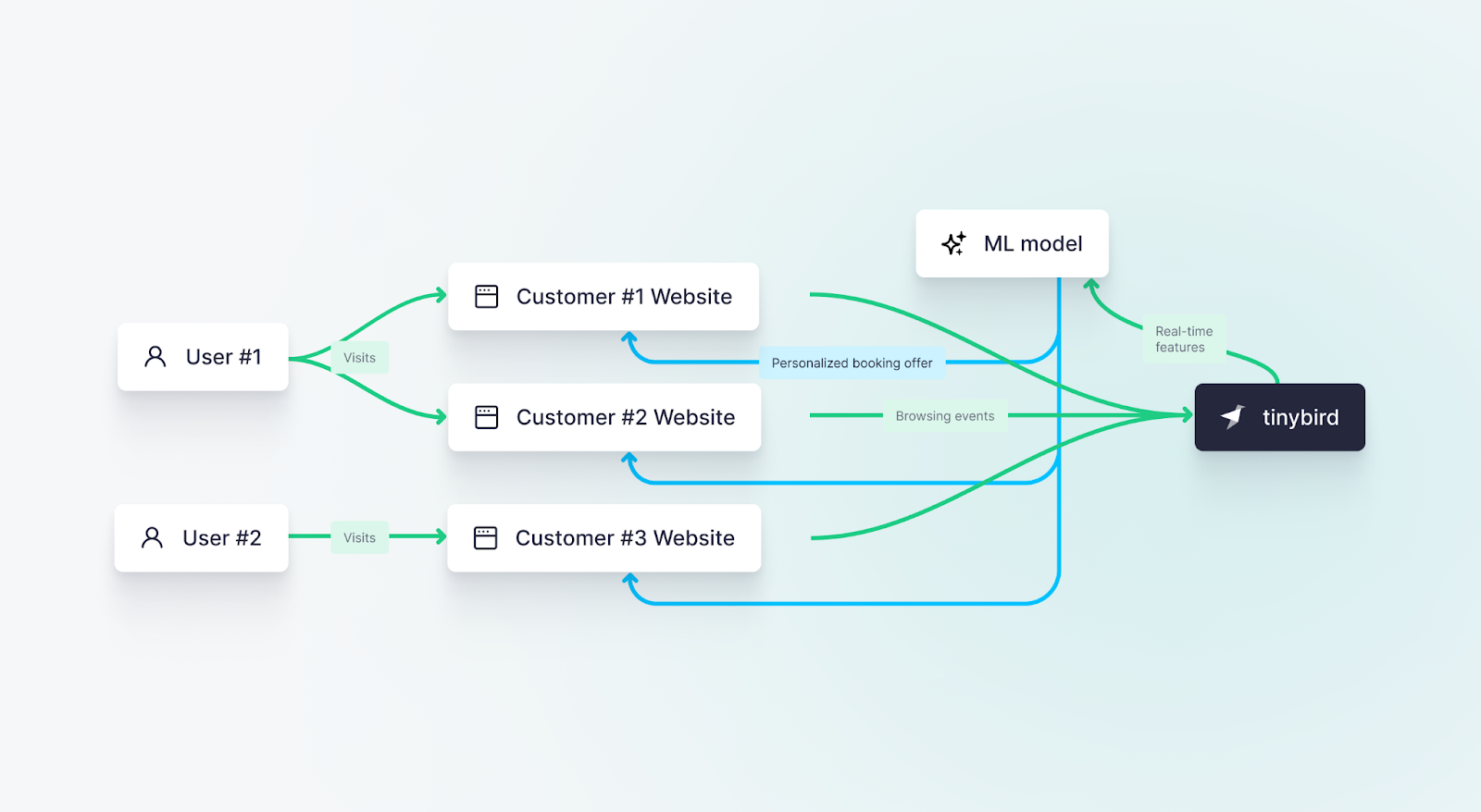 - Feeding the ML System: Tinybird maintains an up-to-date vector of transformations (the “features”) for every visitor, which is then accessed by the Platform’s ML model to serve an offer with a high likelihood of conversion during booking.