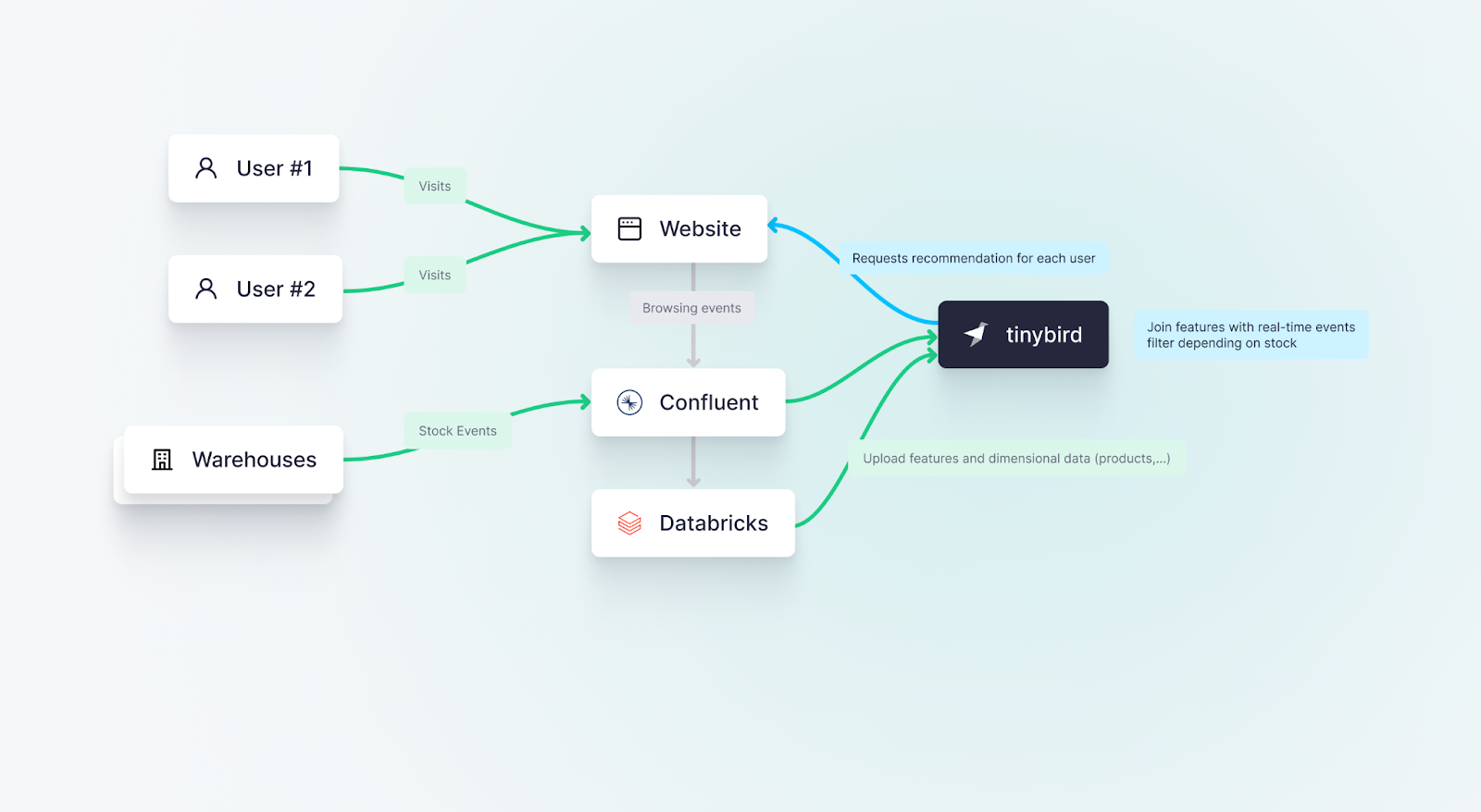 - Data Aggregation with Tinybird: User traffic data on the eCommerce website, including product views, cart activities, and completed sales, is captured into Confluent and forwarded to Tinybird for real-time aggregations. This data provides a live snapshot of customer behavior and interactions, serving as a rich source of information for various analytics and machine learning tasks.