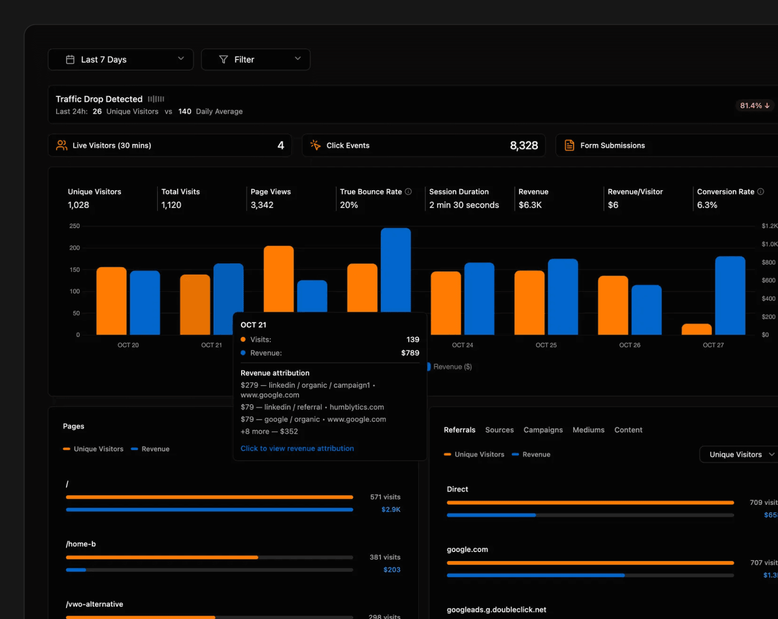 Humblytics takes a different approach. Instead of requiring marketers to manually configure tracking for every button click and form submission, the platform automatically captures everything with a single script. Then it intelligently parses the data to surface only the insights that matter.